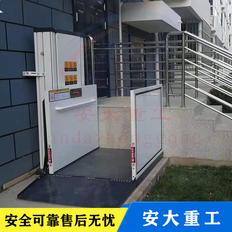無障礙升降平臺由升降平臺、導(dǎo)軌和驅(qū)動箱等三大部分組成:升降平臺是由C型鋼材為主體部件,采用“翹橋自復(fù)位開關(guān)操作運行”,無基坑式安裝,直接固定于混凝士地面(無底抗室外應(yīng)用情況下,平臺下方混凝土地面不得低于周圍地面),手動液壓閥打開時升降底板能手動下降;液壓驅(qū)動,升降平穩(wěn)安全,外部采用拉絲不繡鋼材料和鋁板靜電噴塑機箱佰板,外形小巧美觀,不阻得周邊環(huán)境。殘疾人升降機直接安裝于地面,無需土建配套地坑,施工簡便,產(chǎn)品放置戶外不易積水,不易生繡,維護簡便,升降高度1-6米。