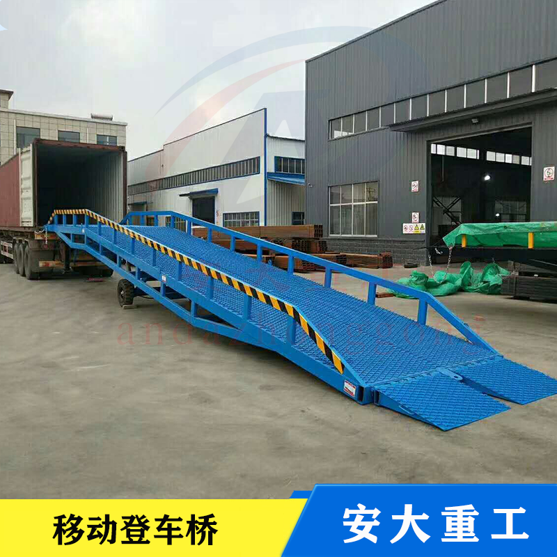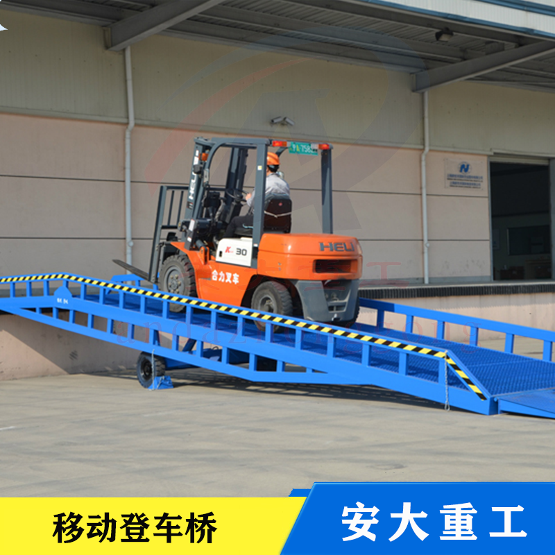 移動式登車橋式與叉車配合使用的貨物裝卸輔助設備,可根據汽車車廂的高低調節高度,叉車可以直接通過本設備駛入車廂內部機制進行貨物的批量裝卸,僅需單人作業即可實現貨物的快速裝卸